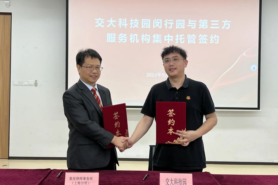 为助力企业科技创新和经济发展护航保障,提供高质量维权公益援助,会上举行了“上海市开发区协会维权援助工作站交大科技园闵行园工作室”揭牌仪式,交大科技园闵行园与7M体育上海分所进行了托管签约。